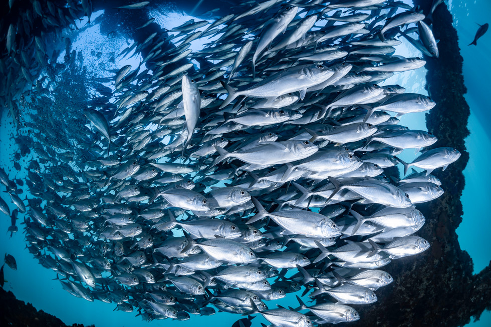 Above: Top: - School jacks swarm the dive site. Bottom: - A diver poses behind a grey nurse shark.